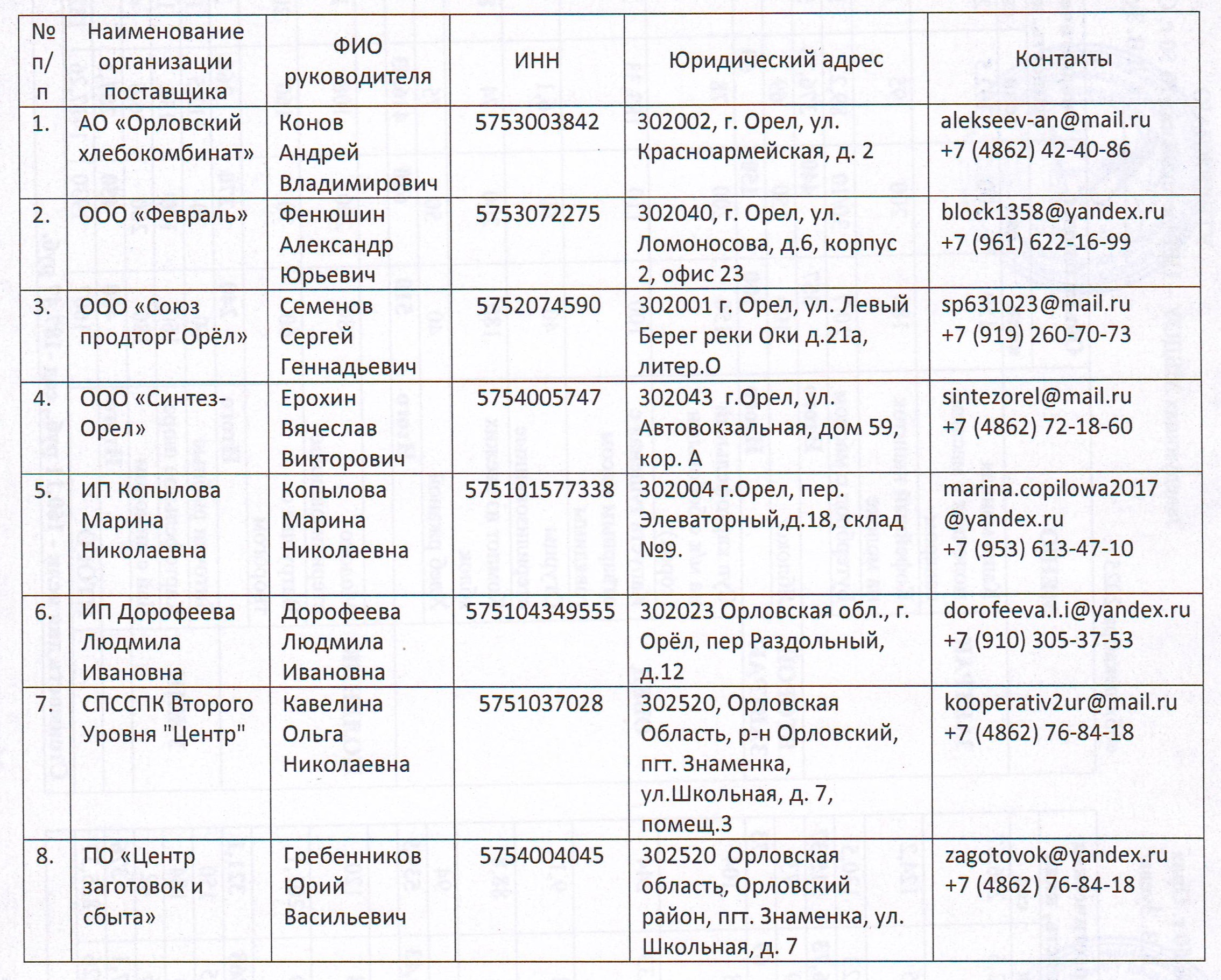 Перечень юридических лиц и индивидуальных предпринимателей, поставляющих (реализующих) пищевые продукты и продовольственное сырье