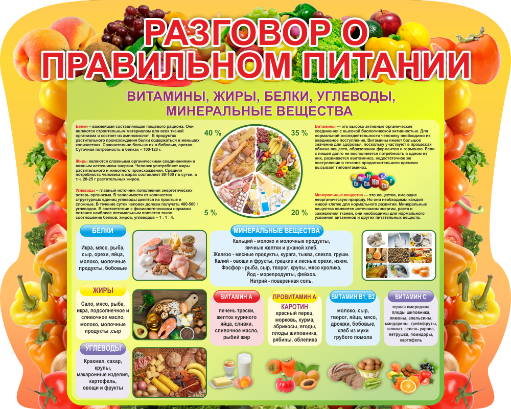 Ежедневно дети получают питание сбалансированное по количеству белков, жиров, углеводов, витаминов. В рационе присутствуют свежие овощи, соки, кисломолочные продукты.