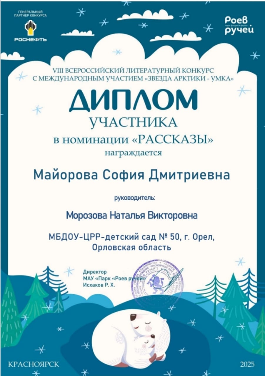 Какой опыт обобщался: Использование интерактивных игр в формировании элементарных математических представлений старших дошкольников Аттестация: Высшая квалификационная категория. Печатные публикации: 2023г. Конспект занятия-викторины для детей старшего дошкольного возраста по теме: «Наши любимые животные», Электронный сборник методических материалов «Сборник РИП «Мы твои друзья»», Орёл, 2023г. http://оиро.рф/wp-content/uploads/2023/08/Sbornik-My-tvoi-druzya-2023-g..pdf 2022г. Статья: «Анализ способов укладывания детей в дошкольных образовательных учреждениях в тихий час». /Всероссийский научно-педагогический журнал "Академия педагогических знаний" выпуск №73, часть 5 - октябрь, 2022г. 2021г. Статья: «Актуальные проблемы дошкольного образования». Сборник ФГБОУ ВО «Орловский государственный университет имени И.С. Тургенева» «Актуальные проблемы дошкольного образования» том 2 выпуск 17 - декабрь 2021г. Общественная и профессиональная деятельность: Член первичной организации профсоюза МБДОУ с 2016г..В составе творческих групп: - Реализация программы ФИП 2020-2023гг. «Развитие качества дошкольного образования с использованием Инструментария мониторинга качества дошкольного образования на образовательной платформе «Вдохновение» (педагог-экспериментатор). - Член рабочей группы по разработке ООП. Активный член профсоюзного кружка воспитателей ДОУ «Содружество». Народная дружина Заводского района г. Орла, народный дружинник, 01.09.2023г. |