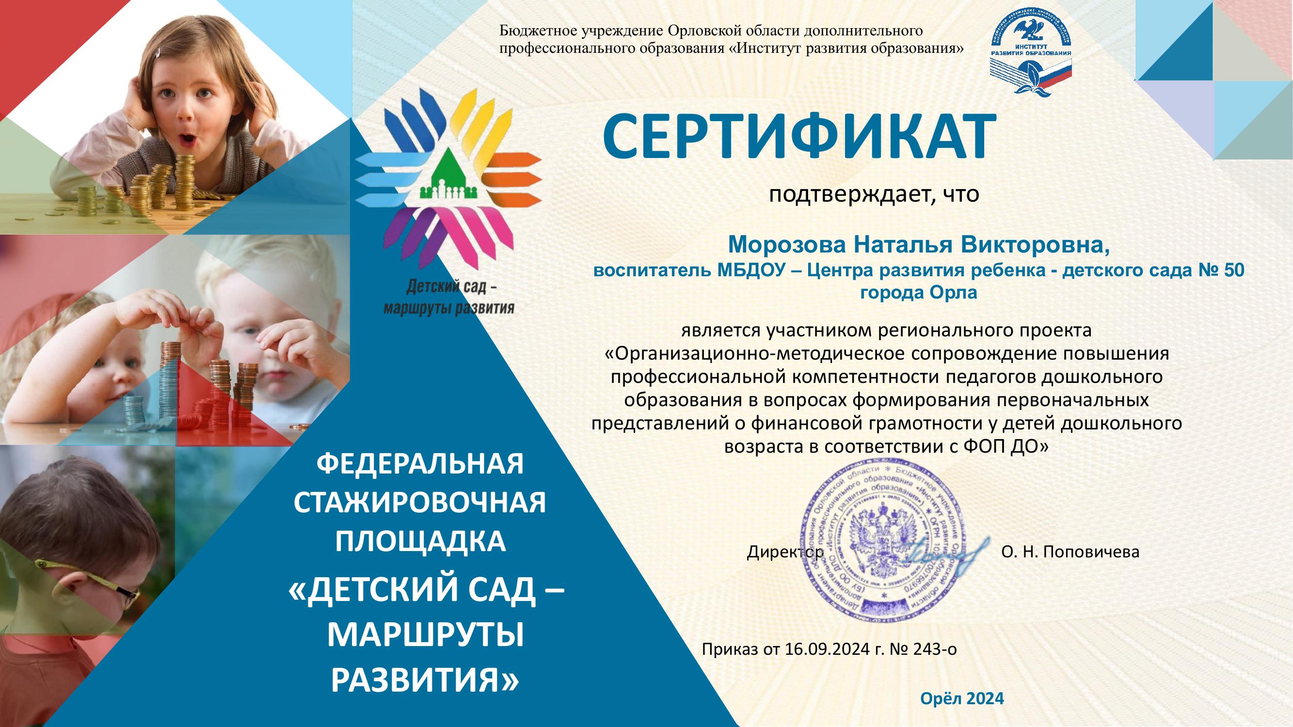 Участие в работе профессионального объединения Реализация программы 2024-2026гг. «Формирования первоначальных представлений о финансовой грамотности у детей дошкольного возраста» (участник стажировочной площадки «Организационно-методическое сопровождение педагогов по вопросам формирования первоначальных представлений о финансовой грамотности у детей дошкольного возраста», 2024г.). 19.11.2024 – Проведение финансовой викторины «Знатоки в мире финансов» с детьми старшего дошкольного возраста для слушателей курсов БУ ОО ДПО «Институт развития образования». |
